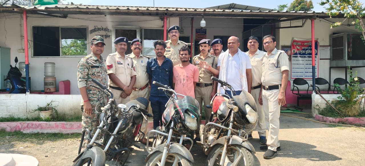 एसएसपी राजेश कुमार अग्रवाल (भा.पु.से.) के निर्देशन पर थानों में पंजीबद्व प्रकरणों के आरोपियों की धरपकड़ एवं गिरफ्तारी कार्यवाही लगातार पुलिस द्वारा लगातार की जा रही है। इसी कड़ी में थाना मणीपुर पुलिस के द्वारा मोटर साइकिल चोरी के प्रकरण में दो आरोपियों को गिरफ्तार एवं उनके कब्जे से तीन चोरी गई मोटर साइकिल वाहन जप्त कर न्यायिक अभिरक्षा में भेजा गया है।