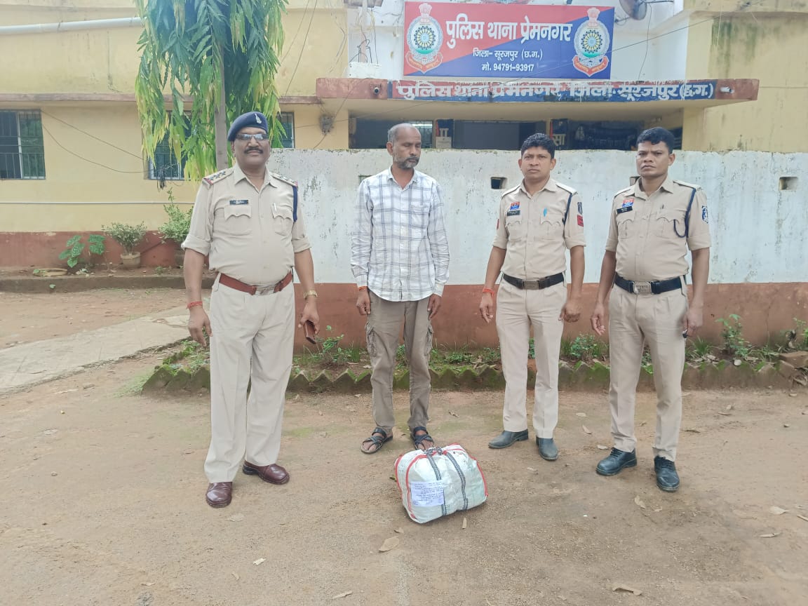सरगुजा समय सूरजपुर:- डीआईजी व एसएसपी श्री प्रशांत कुमार ठाकुर ने नशे के विरूद्ध जीरो टारलेस की नीति अपनाते हुए सख्त कार्यवाही करने के निर्देश जिले के थाना-चौकी प्रभारियों को दिए है। इसी परिप्रेक्ष्य में दिनांक 22.06.2025 को थाना प्रेमनगर पुलिस को मुखबीर से सूचना मिला ग्राम सरसताल निवासी शशिभूषण दुबे पैदल सिरमिना-कोरबा से ओर से अपने घर की ओर गांजा लेकर आ रहा है।