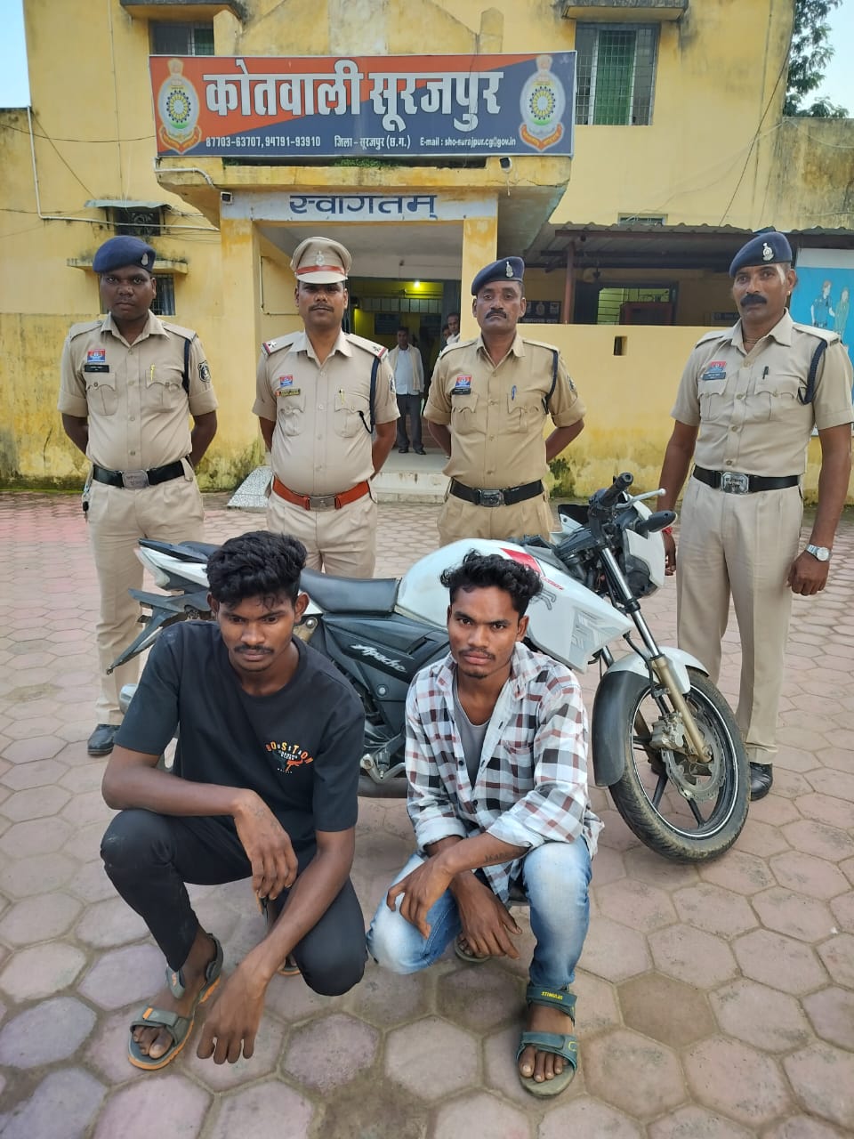 मामले की विवेचना के दौरान थाना सूरजपुर पुलिस ने सीसीटीव्ही फुटेज को खंगाला जिसमें मोटर सायकल को चोरी कर ले जाते अज्ञात व्यक्ति दिखा जिसकी पतासाजी करते हुए दबिश देकर आरोपी मनु सिंह पिता मनकेश्वर उम्र 22 वर्ष एवं चेतन सिंह पिता नंदलाल उम्र 21 वर्ष दोनों निवासी ग्राम मलगा थाना भटगांव को पकड़ा।