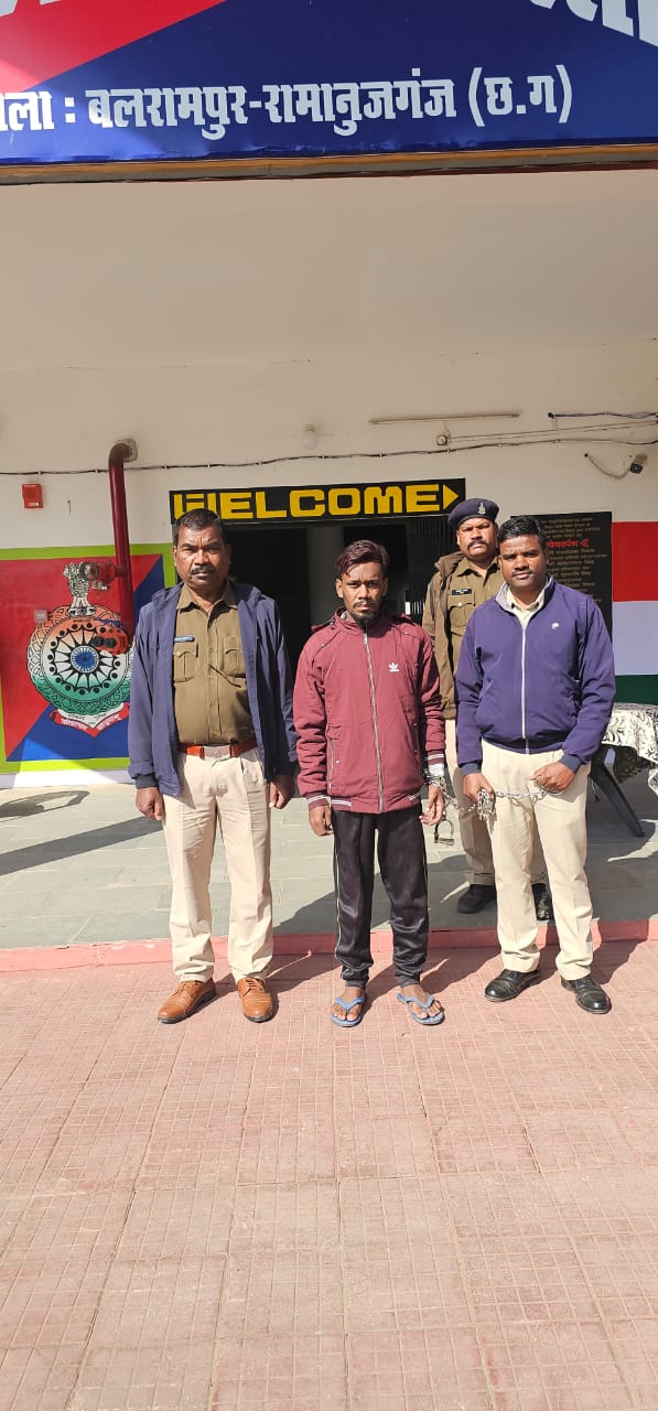 बलरामपुर रामानुजगंज :- मामले का विवरण इस प्रकार है कि थाना पस्ता के अपराध क्रमांक 74/24. धारा 20 बी Ndps act मे दिनांक 20/ 11/ 24 को मुखबीर की सूचना पर दो अपचारी बालको से 1 किलो 500 ग्राम मादक पदार्थ गंजा पकड़ा गया था तथा अपचारी बालक एवं विक्रेता चंद्रदेव सिंह निवासी डूमरखी को गिरफ्तार कर न्यायिक रिमांड पर जेल भेज दिया गया था पूछताछ पर गंजा बिक्री करने वाला मुख्य सरगना ग्राम सराय टोला थाना तूमला जिला जशपुर निवासी रामसेवक राम चौहान पिता शोभित राम चौहान जो घटना दिनांक से फरार चल रहा था, जिसे आज दिनांक को मुखबिर की सूचना पर घेराबंदी कर गिरफ्तार कर न्यायिक रिमांड पर भेजा गया है ।