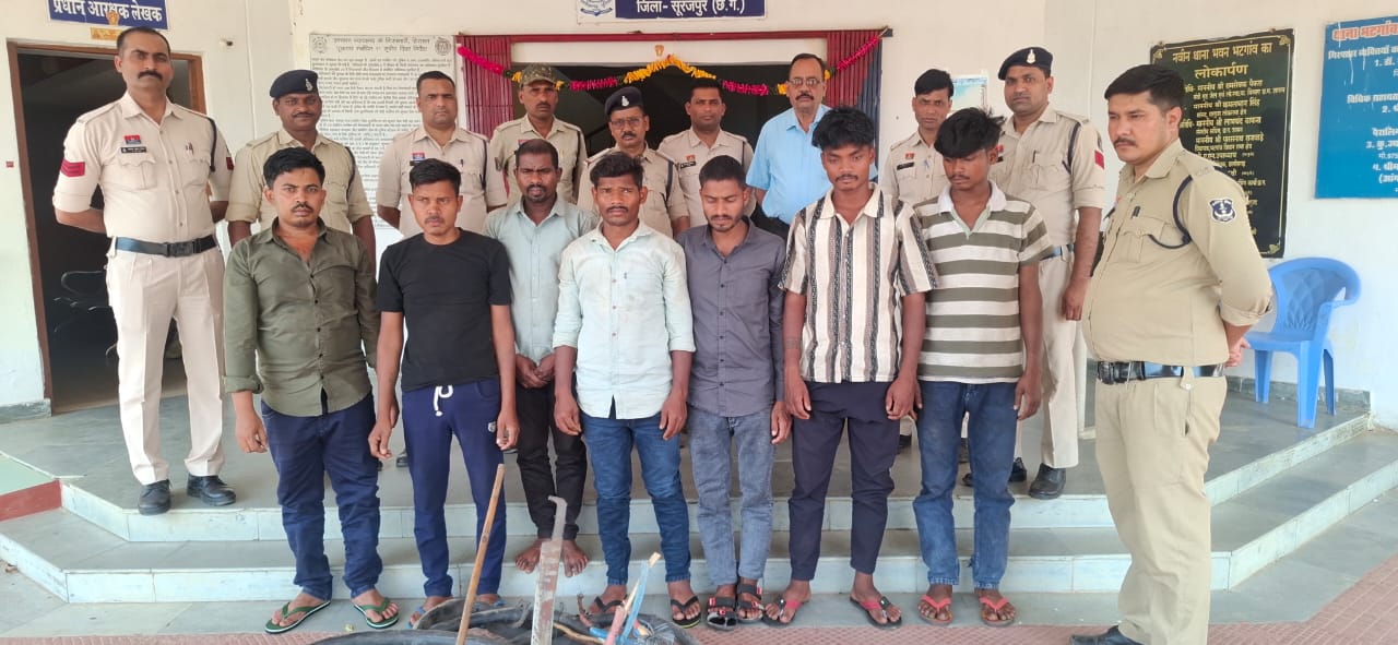 गिरफ्तार आरोपी:-(1) नरेन्द्र सिंह उर्फ पण्डा पिता बोधन उम्र 25 वर्ष निवासी कुम्दा बस्ती, थाना विश्रामपुर (2) रवि उर्फ चरण अगरिया पिता महेश्वर उर्फ महेन्द्र अगरिया उम्र 22 वर्ष ग्राम कसकेला थाना जयनगर (3) कमलेश सिंह पिता सुखलाल सिंह उम्र 22 वर्ष ग्राम कुम्दा बस्ती, थाना विश्रामपुर (4) घुरलू उर्फ घुल्डू पैंकरा पिता रामस्वरूप उम्र 25 वर्ष ग्राम माझापारा कसकेला थाना जयनगर (5) बल्लू सिंह पिता सहदेव सिंह उम्र 28 वर्ष निवासी कुम्दा बस्ती थाना विश्रामपुर (6) दिनेश सिंह पिता स्व. हीरालाल उम्र 26 वर्ष ग्राम कुम्दा बस्ती थाना विश्रामपुर (7) धनु पिता बिरबल उम्र 35 वर्ष ग्राम बंशीपुर थाना भटगांव