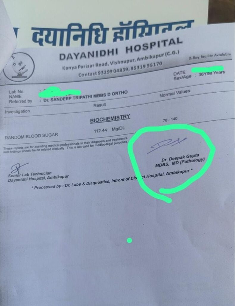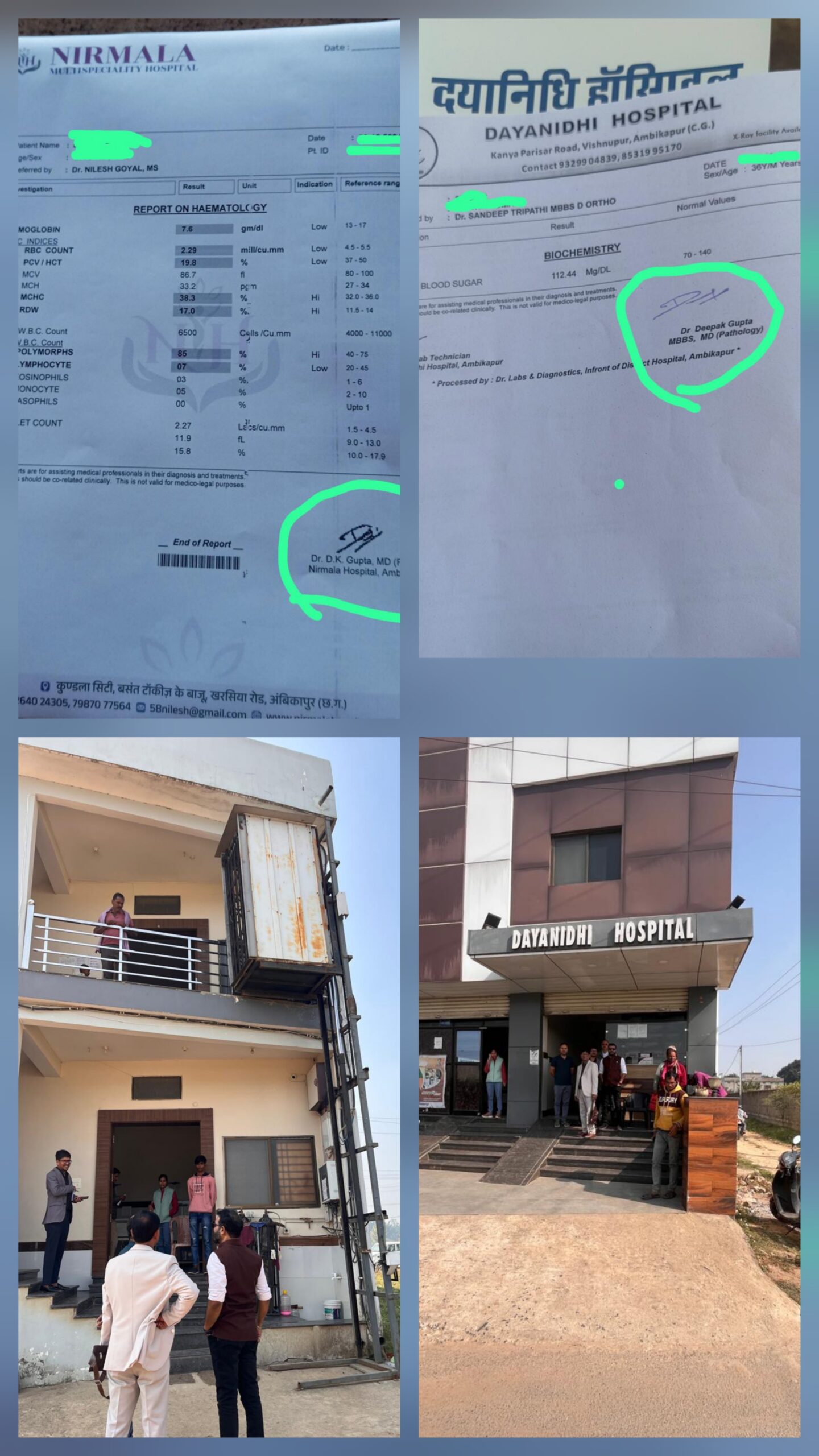 आपकी जानकारी के लिए बता दे कि डॉक्टर दीपक गुप्ता जो कि हमर लैब का सहायक प्रभारी है एवं नर्सिंग होम में जांच टिंबका एक सदस्य भी है के द्वारा जम कर निजी अस्पतालों एवं क्लिनिकों में कार्यवाही करने का भय दिखा कर पैथोलॉजी के संचालन के लिए अपने पास आने को बाध्य करता है इस डॉक्टर के द्वारा सरगुजा जिला में लगभग 10 निजी अस्पताल एवं क्लिनी में अपने सिग्नेचर वाले रिपोर्ट फर्जी तरीके से दिलवाया जा रहा है क्योंकि डिजिटल सिग्नेचर से जारी रिपोर्ट की सत्यता एवं विश्वनीयता पर गंभीर सवाल खड़ा करता है जो कि मरीजों के जान से खिलवाड़ करना ही माना जा सकता है।
