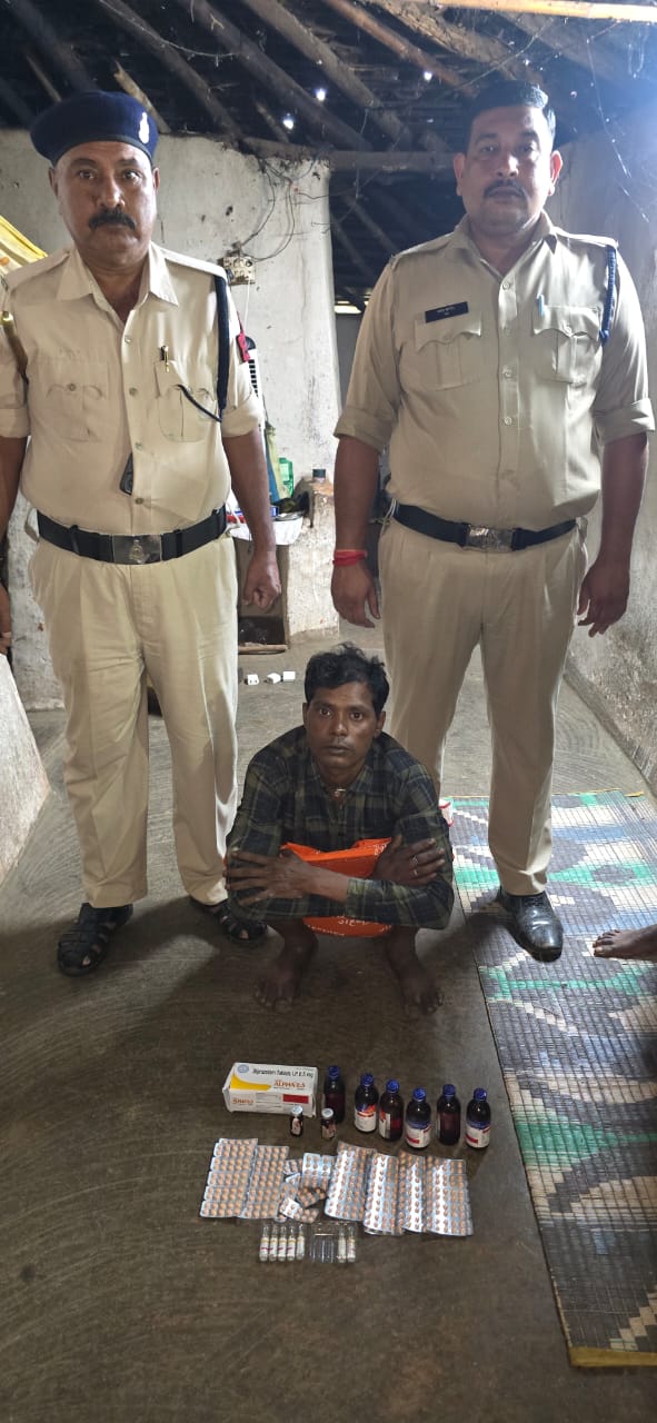उसी की सूचना पर आज सुबह दिनेश ठाकुर के घर दबिश दी गई.. दिनेश ठाकुर के घर की तलाशी में एक सफेद रंग के झोले में 570 नग ALPHA 0.5 ALPRAZOLAM TABLET,, 06 नग CODECTUSS कफ सिरप,,07 नग REXOGESIC INJECTION तथा 02 नग AVIL INJECTION बरामद की गई,,आरोपी दिनेश ठाकुर को एनडीपीएस एक्ट की धारा 21B, 22C के तहत गिरफ्तार कर आज माननीय विशेष न्यायाधीश नारकोटिक्स अंबिकापुर में प्रस्तुत किया गया माननीय न्यायालय ने जेल दाखिल का आदेश प्रदान किया।