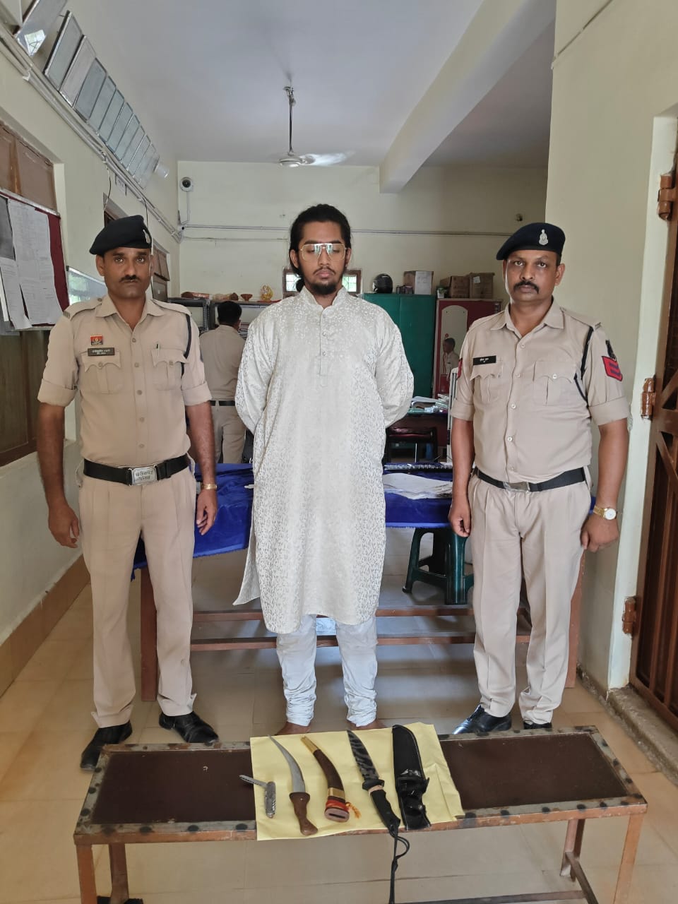 बीती रात अवैध शराब के आरोपियों को छुड़ाने की सिफारिश करने आए युवक के कब्जे से मिला अवैध धारदार हथियार।