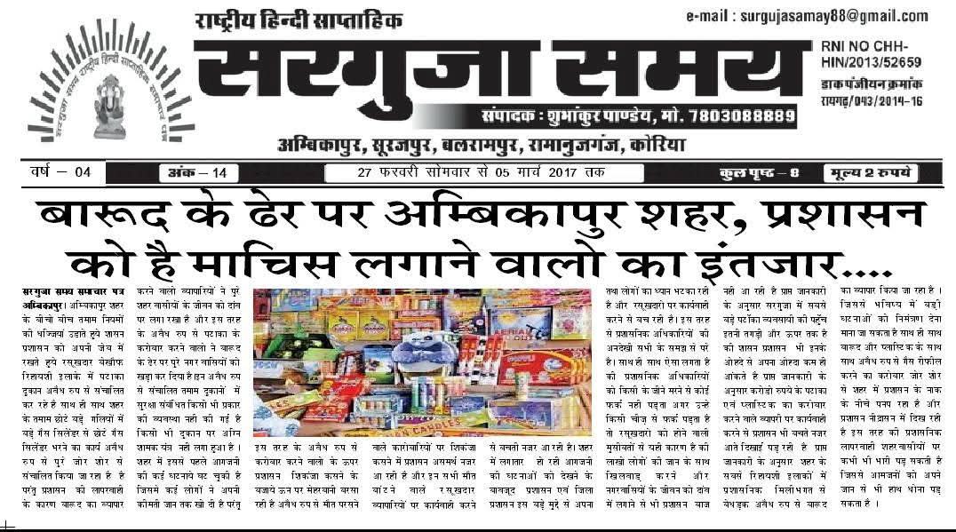 सरगुजा समय अंबिकापुर :- सरगुजा समय समाचार पत्र के माध्यम से हमने पूर्व में ही खबर के माध्यम से बताया था की बारूद के ढेर पर बसा अंबिकापुर शहर प्रशासन कों हैँ माचिस लगाने वालों का इंतजार के शिर्षक के साथ खबर प्रकाशित करके जिला प्रशासन कों अवगत कराया था की भविष्य में बड़ी आगजनी की घटना घट सकती हैँ जिससे शहर वासियों का दिल दहल जाएगा परन्तु जिला प्रशासन एवं कई कलेक्टरों ने शहर के सुरक्षा की चिंता तनिक भी नहीं की और सिर्फ एयर कंडीशन वाले रूम में बैठ अपनी ड्यूटी बजाते हुए चले गए।