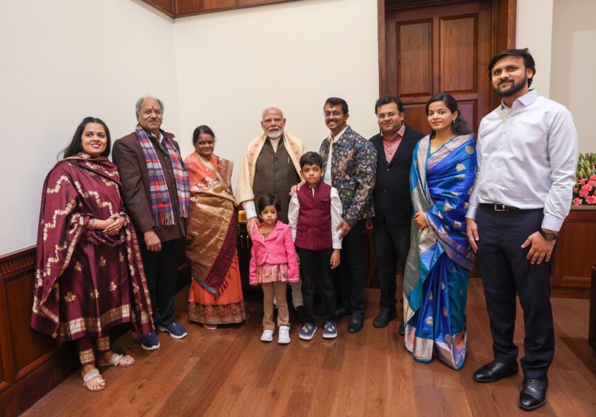 सांसद बृजमोहन अग्रवाल प्रधानमंत्री मोदी से अपनी धर्मपत्नी सरिता और दोनों बेटो बेटी और दमांद के साथ भेंट की. उन्होंने ने बताया हमने प्रधानमंत्रीजी को बेटे की शादी में आने का निमंत्रण दिया और उनसे आशीर्वाद लिया. स्नेह प्रेम, आत्मीयता और अपनेपन से भरे प्रधानमंत्री हमें अपने अभिभावक और बड़े भाई लगे. वह मानवीय संवेदनाओं से भरे अत्यंत सहज और सरल है.