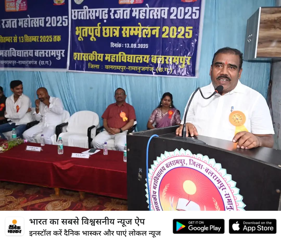 छत्तीसगढ़ रजत महोत्सव 2025 के अवसर पर शासकीय महाविद्यालय बलरामपुर में आज भूतपूर्व छात्र सम्मेलन (Alumni Meet) का भव्य आयोजन सम्पन्न हुआ। यह सम्मेलन महाविद्यालय की स्थापना के प्रथम बैच 2010 से लेकर 2025 तक के सभी पासआउट विद्यार्थियों को समर्पित रहा।