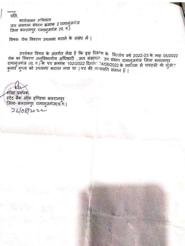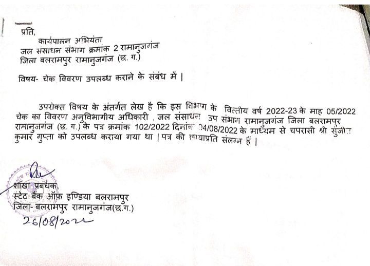 जिसके प्रतिउत्तर में शाखा प्रबंधक स्टेट बैंक ऑफ़ इण्डिया ने बताया की -उपरोक्त विषय के अंतर्गत लेख है कि इस विभाग के वित्तीय वर्ष 2022-23 के माह 05/2022 चेक का विवरण अनुविभागीय अधिकारी, जल संसाधन उप संभाग रामानुजगंज जिला बलरामपुर रामानुजगंज (छ.ग.) के पत्र क्रमांक 102/2022 दिनांक 14/08/2022 के माध्यम से चपरासी श्री सुजीत कुमार गुप्ता को उपलब्ध कराया गया था । पत्र की छायाप्रति संलग्न हैं।
