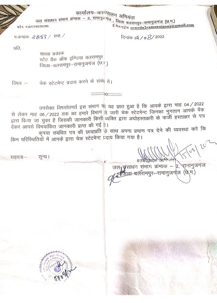 जैसा की आप ऊपर दिए गए पत्र में स्पस्ट रूप से देख सकते हैं की प.क्रमांक. २853/ स्था./ दिनांक 15/08/2022 कों जल संसाधन रामानुजगंज संभाग क्रमांक 02 के द्वारा स्टेट बैंक ऑफ इंण्डिया बलरामपुर जिला-बलरामपुर-रामानुजगंज (छ.ग.) के शाखा प्रबंधक कों जारी करते हुए विषय :-चेक स्टेटमेन्ट प्रदाय करने के संबंध में।