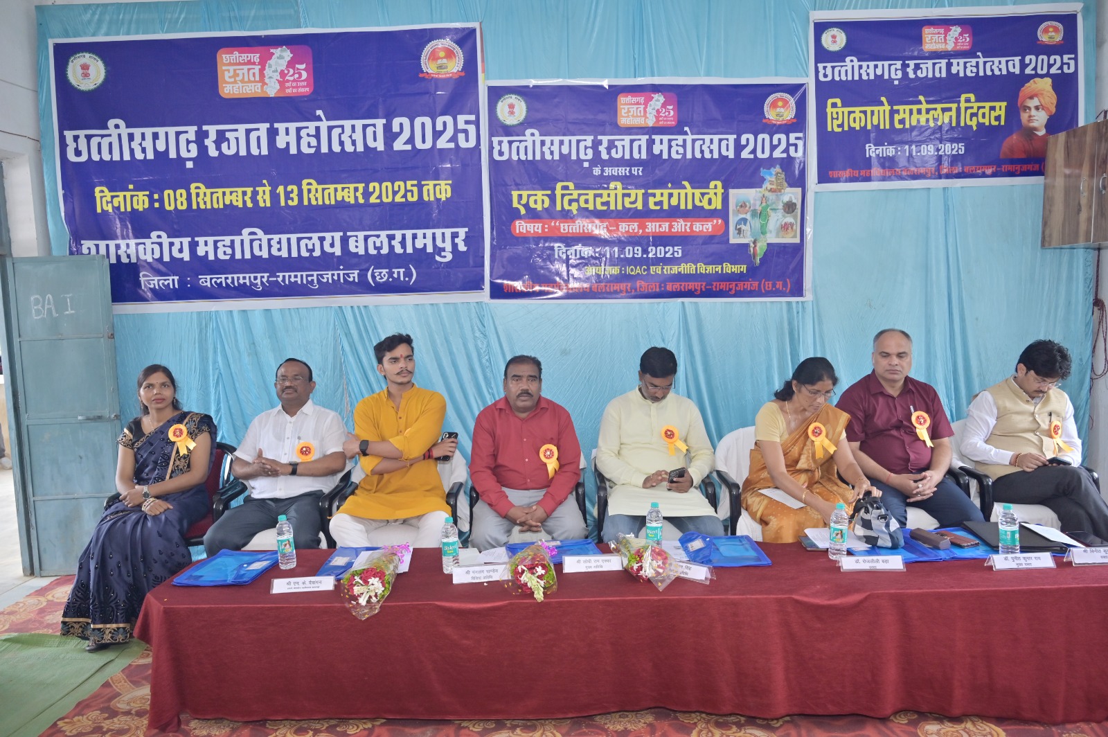 छत्तीसगढ़ राज्य स्थापना के 25 वर्ष पूर्ण होने पर “छत्तीसगढ़ रजत महोत्सव” के अंतर्गत शासकीय महाविद्यालय बलरामपुर में “छत्तीसगढ़: कल, आज और कल” विषय पर एक दिवसीय राज्य स्तरीय संगोष्ठी का सफल आयोजन किया गया। संगोष्ठी का उद्देश्य छत्तीसगढ़ की ऐतिहासिक पृष्ठभूमि, पिछले 25 वर्षों की उपलब्धियों, भविष्य की चुनौतियों और संभावनाओं पर विचार करना था। साथ ही सामाजिक, सांस्कृतिक और आर्थिक परिदृश्य की समीक्षा भी की गई।