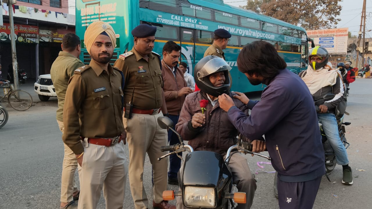 यातायात नियमों का पालन करने हेतु जागरूकता कार्यक्रम का आयोजन किया गया। थाना मणिपुर क्षेत्रांतर्गत बिलासपुर चौक के पास सड़क पर आने जाने वाले वाहन चालकों को यातायात नियम का पालन करने तो सामान्य निर्देश दिया गया साथ ही दोपहिया वाहन चालक जिन्होंने हेलमेट लगाया था उन्हें गुलाब का फूल देकर धन्यवाद ज्ञापित करते हुए हेलमेट नहीं लगाने वाले दुपहिया वाहन चालकों को निःशुल्क हेलमेट भेंट कर वाहन चलाते समय आवश्यक रूप से पहनने की समझाइश दी गई।
