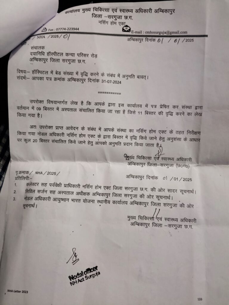 इसी क्रम में अगर आप देखेंगे तो उक्त हॉस्पिटल जो अपने शुरुवाती दौर में महज 09 बेड का हॉस्पिटल था अचानक किस नर्सिंग होम एक्ट के नोडल ऑफिसर ने उक्त दयानिधि अस्पताल का निरिक्षण किया जिसमे तमाम खामियों के बावजूद 11 बेड बढ़ाने की जरुरत आन पड़ी जिसके कारण उक्त 09 बेड वाले हॉस्पिटल कों 11 बेड बढ़ाने की अनुशंसा करते हुए टोटल 20 बेड का अस्पताल बना देने की अनुमति प्रदान कर बैठा इस बेतुके फरमान कों जारी करने की जरुरत क्यों पड़ी उक्त निरिक्षण करने वाले नर्सिंग होम एक्ट के नोडल ऑफिसर एवं उनकी टीम की जाँच जिनके कृत्य संदेहास्पद हैं की जाँच कब तक होंगी यह भी विचारणीय बात हैं।