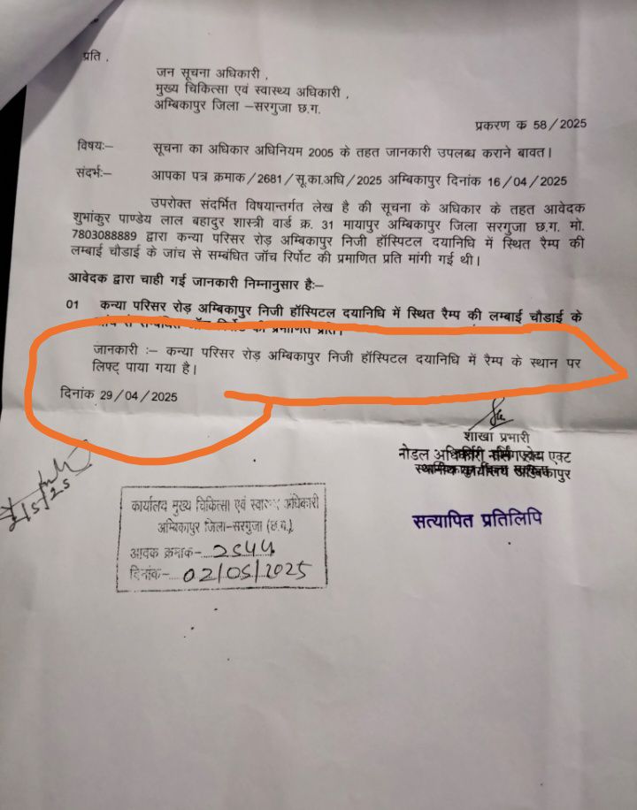 सबसे महत्वपूर्ण बात यह हैं की सरगुजा समय के संपादक ने जब सूचना के अधिकार के तहत जानकारी चाही तो विभाग ने बताया की उक्त हॉस्पिटल में रैम्प के जगह लिफ्ट पाया गया। इससे विभाग के अफसर का दलाली पूर्ण जानकारी आवेदक कों प्रदान करना एवं नियम विरुद्ध तरीके से अस्पताल कों अवैध संरक्षण प्रदान करना माना जा सकता हैं जिससे विरुद्ध बचाव के लिए सम्बंधित अस्पताल से कार्यवाही करने वाले अफसर के द्वारा बतौर रिश्वत मोटी रकम प्राप्त करना माना जा सकता हैं। जो की जाँच का विषय हैं।