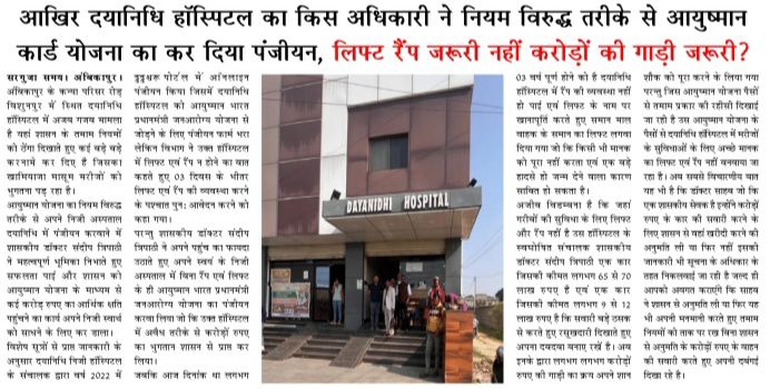 आपकी जानकारी के लिए बता दें की उक्त दयानिधि हॉस्पिटल में आयुष्मान योजना के तहत पंजीयन नहीं करने में सबसे बड़ी कमी विभाग द्वारा बताई गई थी की उक्त हॉस्पिटल में रैम्प एवं लिफ्ट, पार्किंग की व्यवस्था नहीं हैं बावजूद उसके किस दलाली पूर्वक कार्य करने वाले अफसर के द्वारा किये गए गोलमाल के बाद दयानिधि अस्पताल का आयुष्मान योजना के तहत पंजीयन किया गया और उक्त हॉस्पिटल के द्वारा फर्जी तरीके से आयुष्मान योजना के माध्यम से करोड़ों रूपए का चपत शासन कों लगा डाला यह जाँच का विषय हैं।