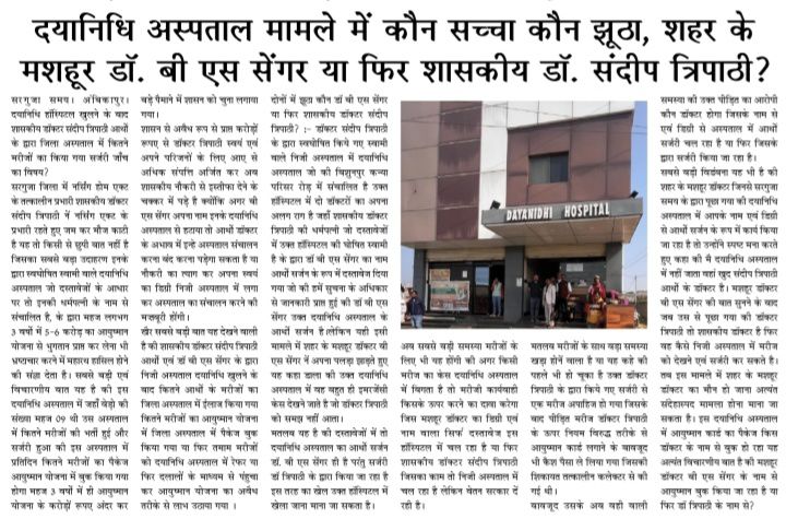 सबसे बड़ी बात की इस दयानिधि अस्पताल में अर्थो सर्जन कौन हैं किसके नाम से आयुष्मान कार्ड ब्लाक किया जाता हैं जिस बी एस सेंगर डॉक्टर की अर्थो डिग्री का उपयोग संदीप त्रिपाठी के द्वारा किया जा रहा हैं वह डॉक्टर सरगुजा समय कों फोन में जानकारी देते हैं की वह दयानिधि हॉस्पिटल में बैठते ही नहीं हैं और संदीप त्रिपाठी स्वयं अर्थो का डॉक्टर हैं। तो अब सबसे बड़ी समस्या एवं जाँच इस विषय की होनी चाहिए की क्या शहर के मशहूर अर्थो के डॉक्टर ने सिर्फ काम चलाने या अपने नाम का उपयोग करने के लिए दयानिधि हॉस्पिटल कों अपनी डिग्री दें दी क्योंकि बिना डॉक्टर सेंगर के मर्जी के उक्त हॉस्पिटल संचालक के द्वारा डॉक्टर बी एस सेंगर की डिग्री का उपयोग नहीं किया जा सकता।